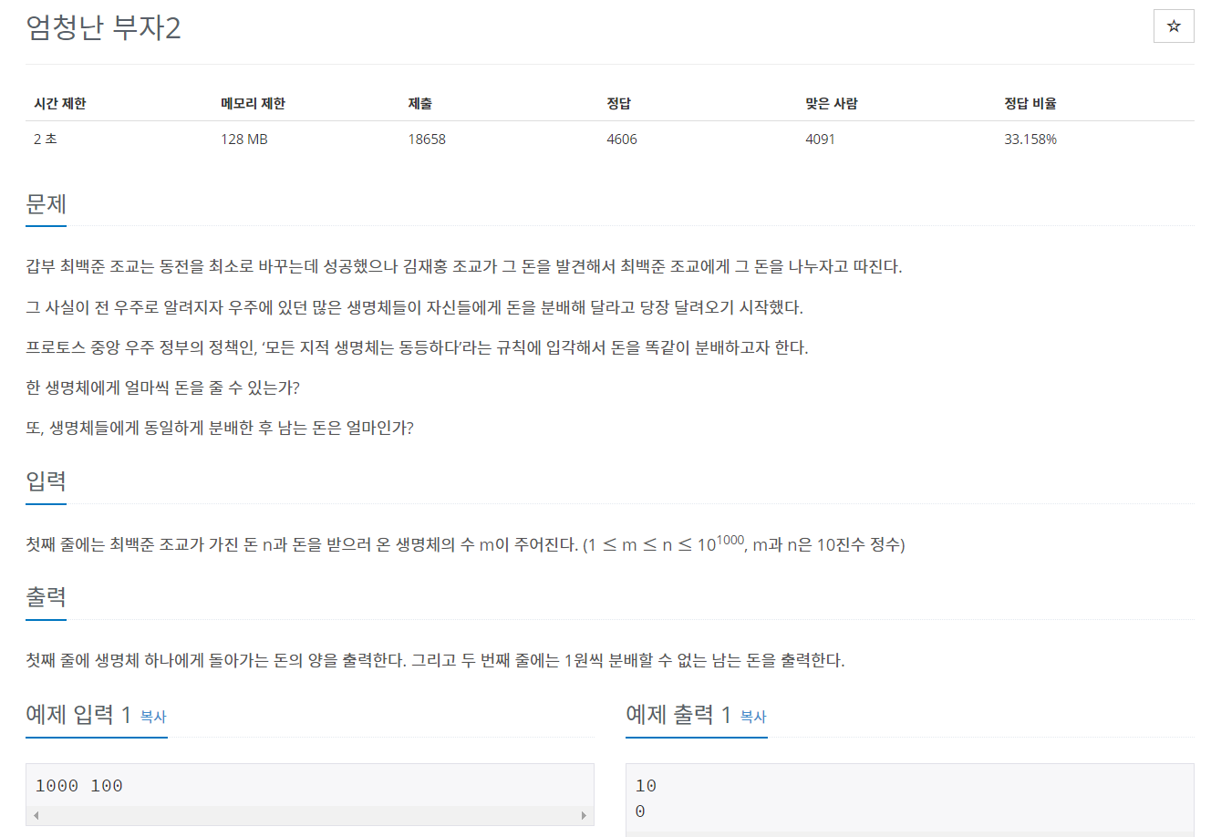 첫째 줄에는 최백준 조교가 가진 돈 n과 돈을 받으러 온 생명체의 수 m이 주어진다. (1 ≤ m ≤ n ≤ 101000, m과 n은 10진수 정수)