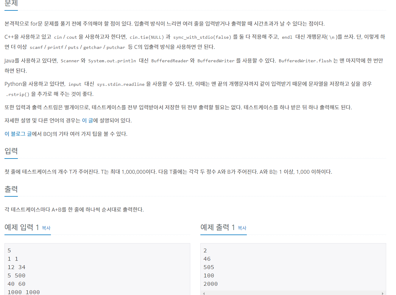 브론즈 2 문제. 빠른 A+B 15552번: 빠른 A+B (acmicpc.net)