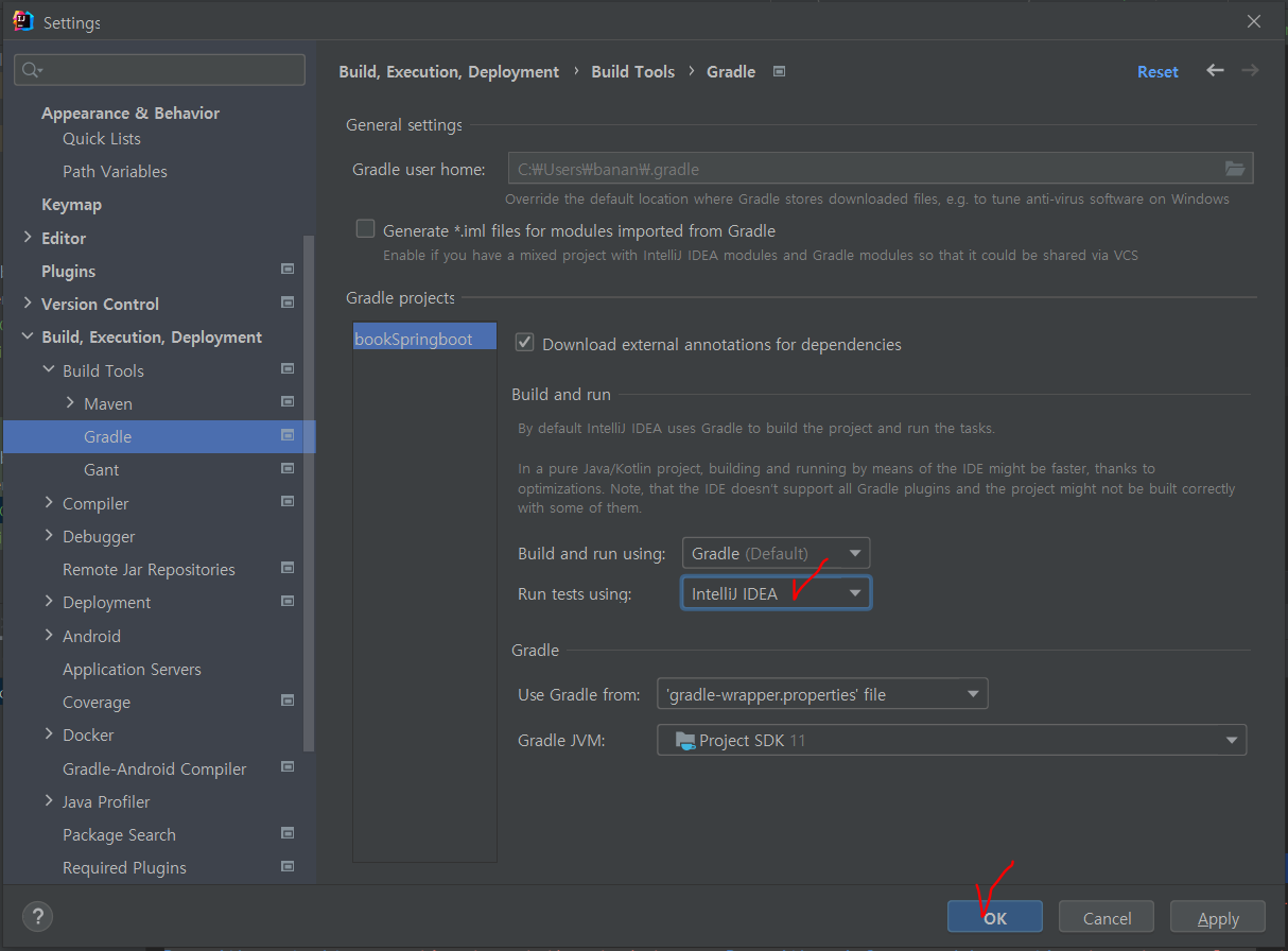 👉 명령 실행자의 기본값이 Gradle이기 때문에 프로젝트를 build하거나 run할 때 Gradle로 실행됨으로써 발생한 문제이다.