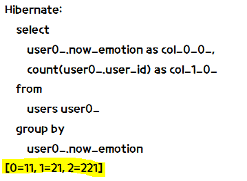 HashMap<String,Integer> emotionMap = userService.findEmotionCount(); // {0: 15, 1: 19, 2: 4}