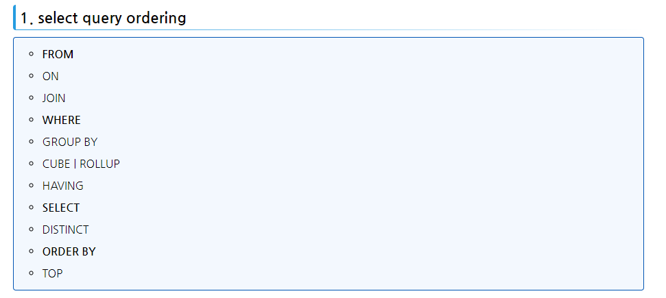 | 1. FROM 테이블명 | 발췌대상 테이블을 참조 |
