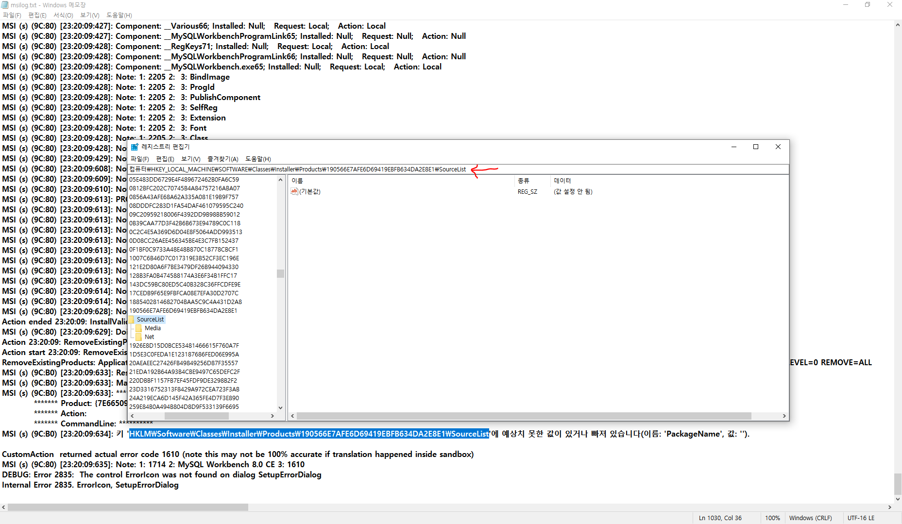 4. 로그 메모장에서 오류 부분 찾고, 레지스트리 편집기에서 문제되는 폴더를 삭제하기
