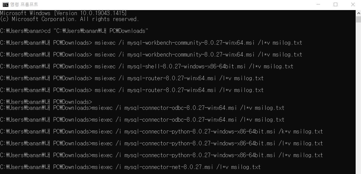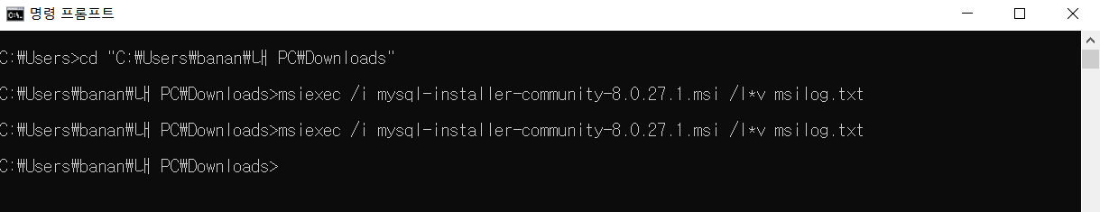 본인이 이와 같은 방법으로 설치한 과정의 cmd 모습이다.