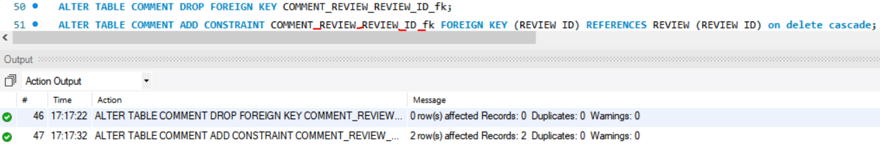 Review id를 외래키로 참조하고 있는 Comment 테이블이 있기 때문에 Review 데이터를 제거하려할 때 이를 참조하고있는 Comment 테이블의 외래키 필드 Review_id의 무결성에 침해되므로 문제가 발생한다. (외래키의 무결성 제약조건에 위배)