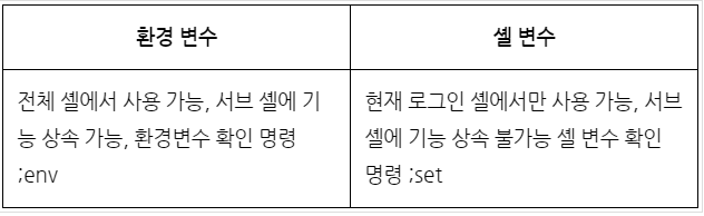 ◦변수: 시스템 환경 정보 저장소. 환경변수(전역)와 셸 변수(지역)로 구분.