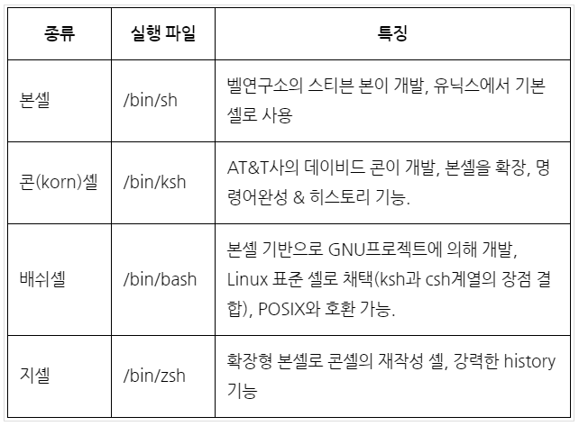 -셸은 커널과 응용 프로그램 사이에서 사용자가 입력한 명령어를 해석하여 커널에 전달하고 커널에서 수행한 것을 사용자에게 전달하는, 대화식 인터페이스를 제공하는 셈이다.
