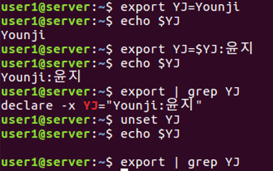 Ex) 환경변수 YJ를 새로 정의하여 확인 후 해제.