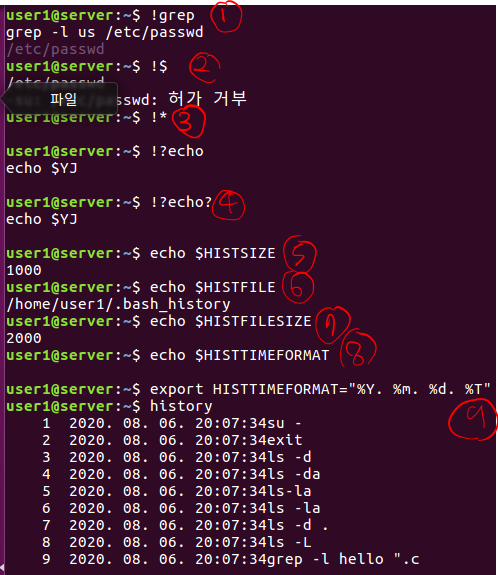④가장 최근에 'echo'를 포함한 단어(명령어를) 출력