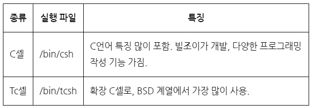 (그래서, C셸은 본셸의 모든 기능+히스토리, 별명, 작업제어기능을 추가로 가지고 있음)