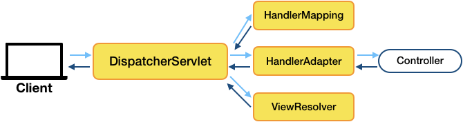 SpringMVC에서 제공해 주고 있는 DispatcherServlet 내부에는 HandlerMapping, HandlerAdapter, ViewResolver(Controller에서 view를 리턴할 경우, 해당하는 view를 찾아 client에게 반환) 등의 주요 역할 메서드가 있습니다.