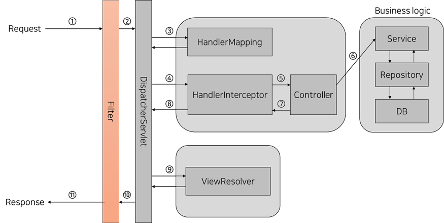 그림에서 알 수 있듯, Request가 들어오면, DispatcherServlet에 진입하기 전에 Filter가 가장 먼저 실행됩니다.