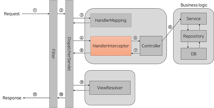인터셉터는 스프링 컨텍스트 내부에서 Controller(Handler)에 관한 요청과 응답에 대해 처리합니다. - 인터셉터는 스프링의 Dispatcher Servlet이 Request를 컨트롤러에 매핑(호출)하기 전과 후에 부가적인 로직을 실행합니다.