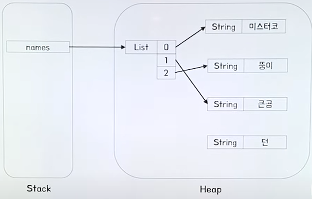 1. Stack에 있는 names라는 참조 변수를 스캔하면서 힙 영영의 참조하고 있는 List 객체를 마킹