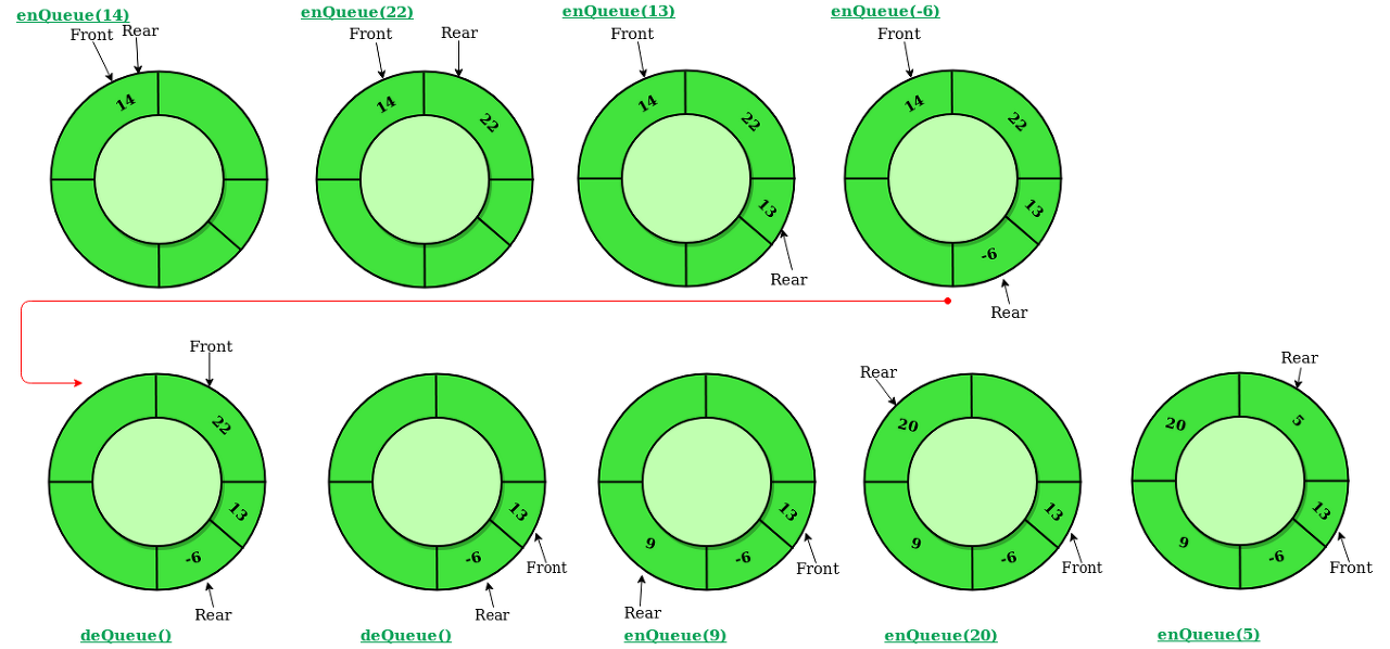 circular queue는 마지막 위치(index)가 첫번째 위치와 연결되어 원을 만드는 형태입니다. (Ring Buffer라고도 불립니다.)