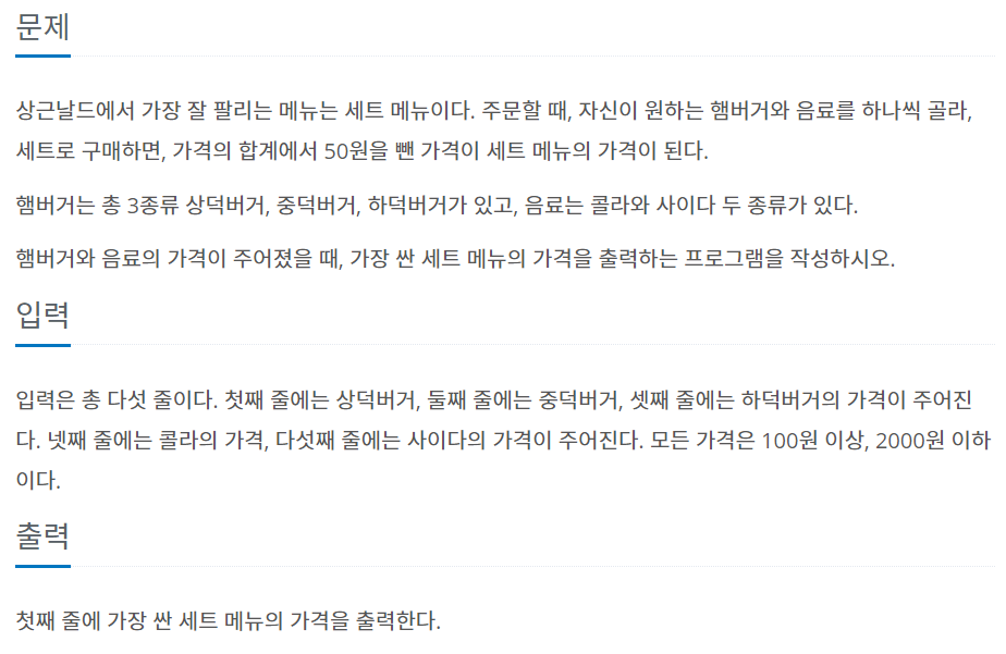 우선 햄버거와 음료를 따로 봐야할 것 같다. 각각 배열로 해주고, 각 배열에서 최솟값을 구하여 세트메뉴값으로 더해준 후, 50원을 빼주고 출력해주면 될 것같다. 최솟값 변수를 하나로 해결하고 싶었지만, 하나의 main함수에서만 코드를 짜기 때문에 두개의 최솟값 변수를 만들어 줬다.