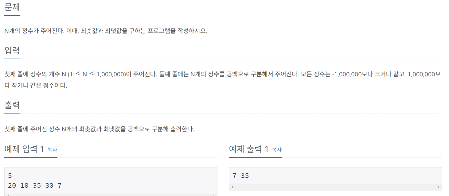 몇개의 값을 넣을 건지 정하고, 그 값들을 넣은 후, 그 값들 중 최솟값고 최댓값을 구하면 되는 문제이다.