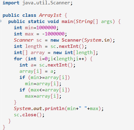 처음에 넣는 값을 배열의 길이에 넣고, 반목문을 돌리면서 값하나하나를 배열에 넣어줬고, 넣어주면서 최소최대도 같이 처리해주었다.