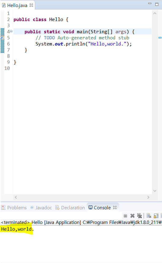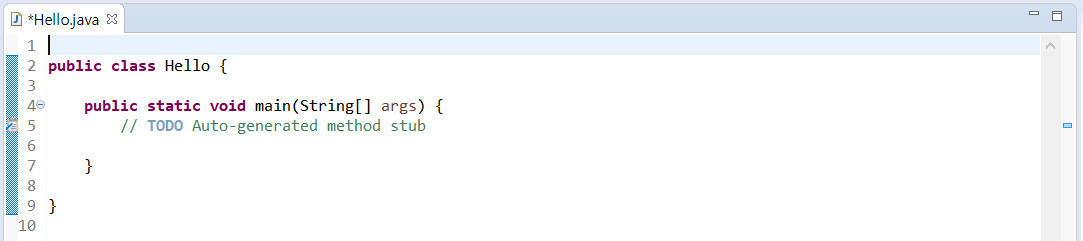 *파일 Hello.java앞에 * 표시가 있는 경우, 아직 저장되지 않았음을 의미함.