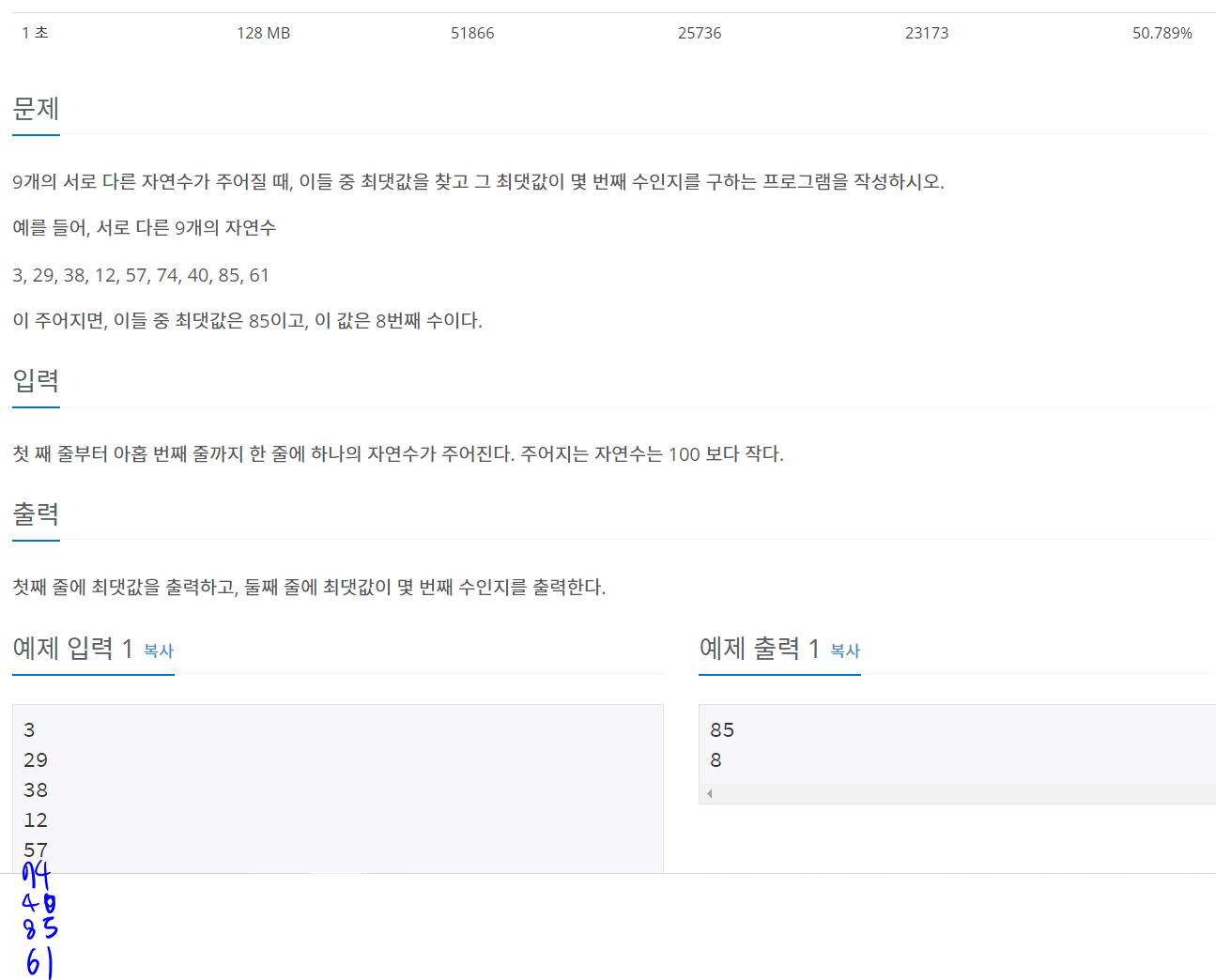 그리고 for문을 돌리면서 배열에 수를 넣는 것과 동시에 최댓값도 비교해주고 만약 max보다 크면 maxnum도 다시 지정해주는 식으로 for문안에서 다 해결했다.