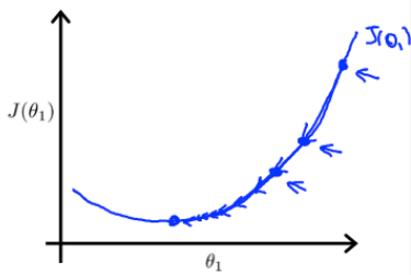 이번 시간에는 하나의 파라미터 Θ1을 이용하여, gradient descent(경사하강)을 구현하는 비용함수를 나타내는 것을 해볼 것이다!