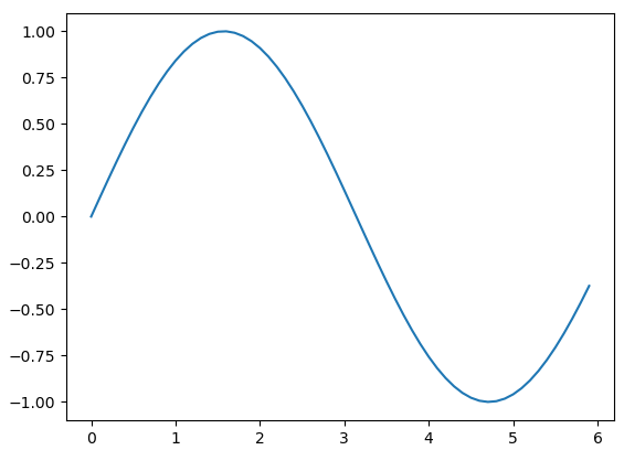 x = np.arange(0, 6, 0.1) # 0에서 6전까지 0.1 간격으로 배열 생성