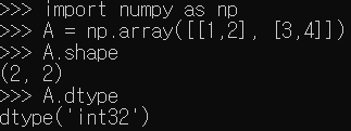 ▶ A.dtype : 행렬에 담긴 원소의 자료형