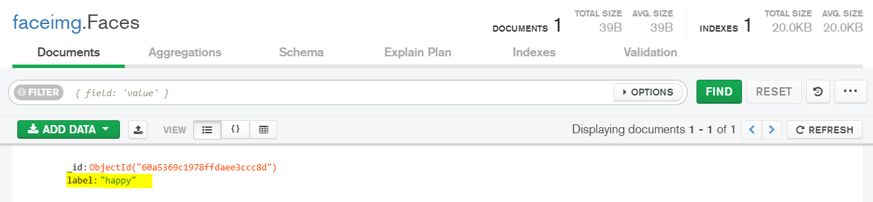 'faces'라는 컬렉션을 생성했다. 그리고, 'label'이라는 field를 추가해보겠다!