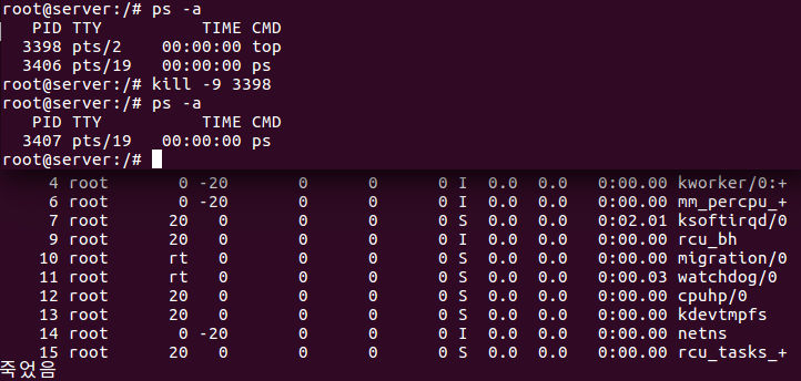 다른 터미널에서 top을 실행하고 ps -a 명령어를 해보면 실행중인 프로세스로 top이 뜬다. 프로세스를 강제 종료 시키는 시그널넘버 9로 PID 3398를 kill하니 죽었음. 이라고 뜬다!!