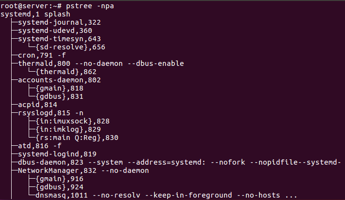 pstree -npa : PID 표시 & PID 정렬 & 명령행 인자를 포함하여 출력한 ps 트리구조