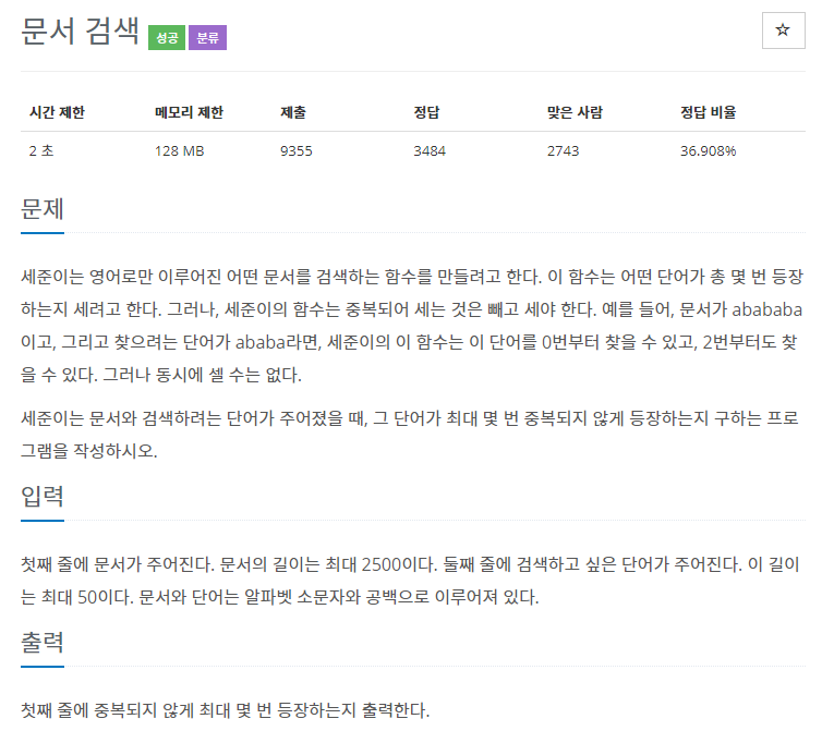 - 첫째 줄을 doc, 둘째 줄을 search로 하고 중복되지 않게 등장한 횟수를 cnt라 한다.