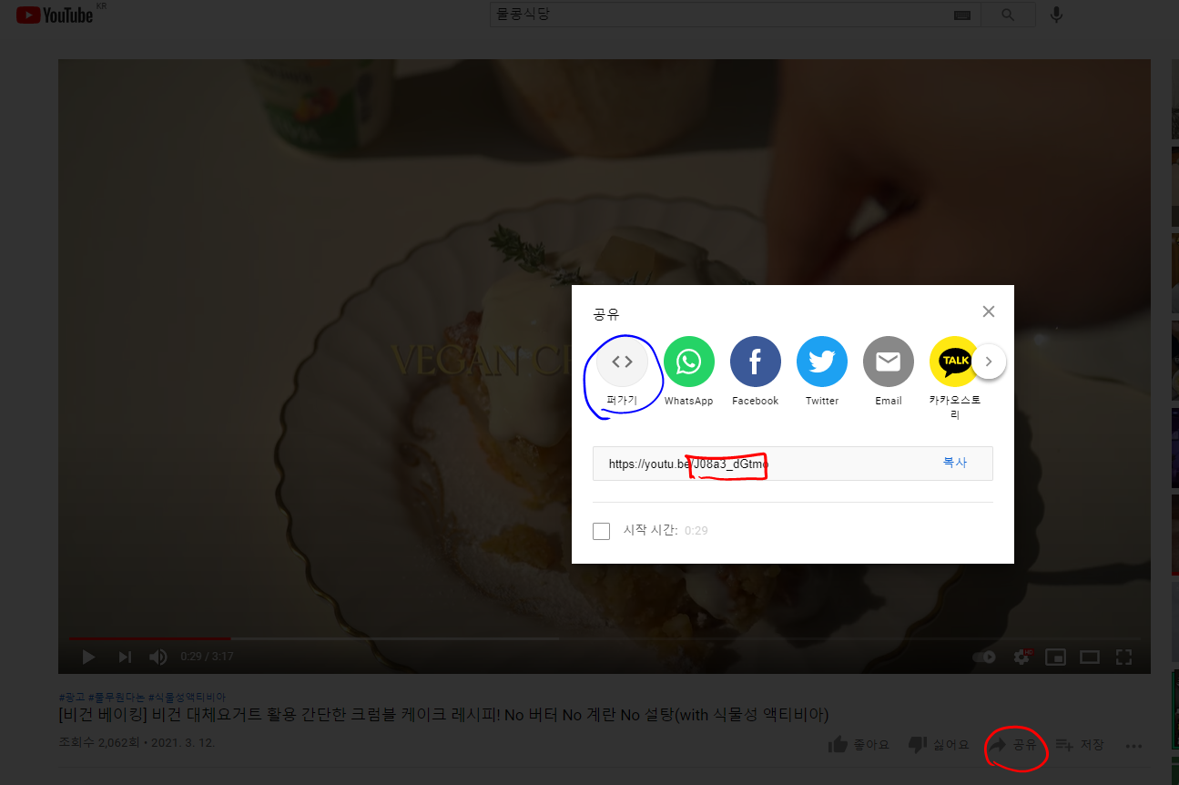 1. 특정 Youtube 영상의 '공유'버튼을 클릭하여 퍼가기 버튼을 클릭하여 코드를 복사한다. (특정 부분만 사용!)